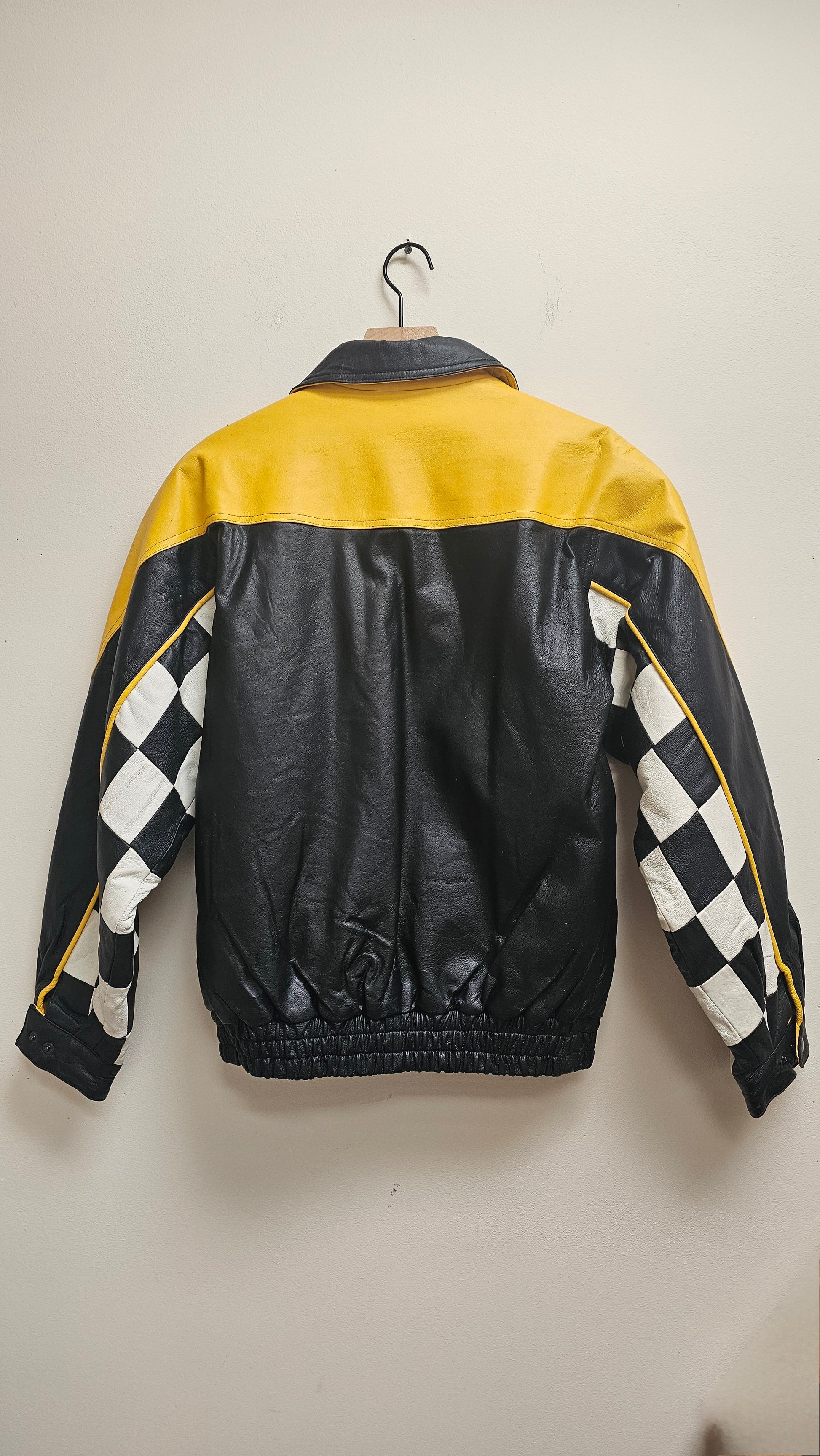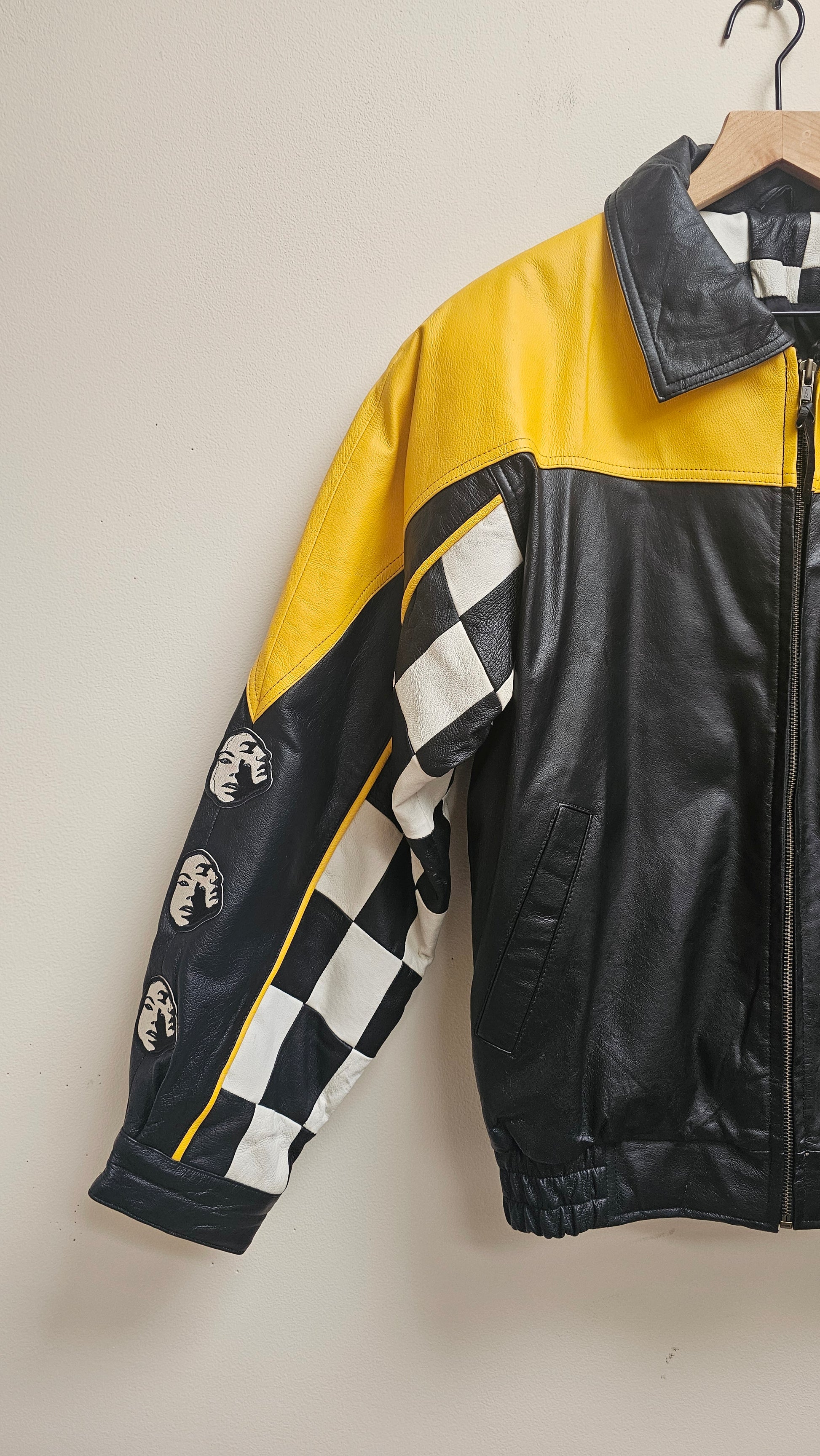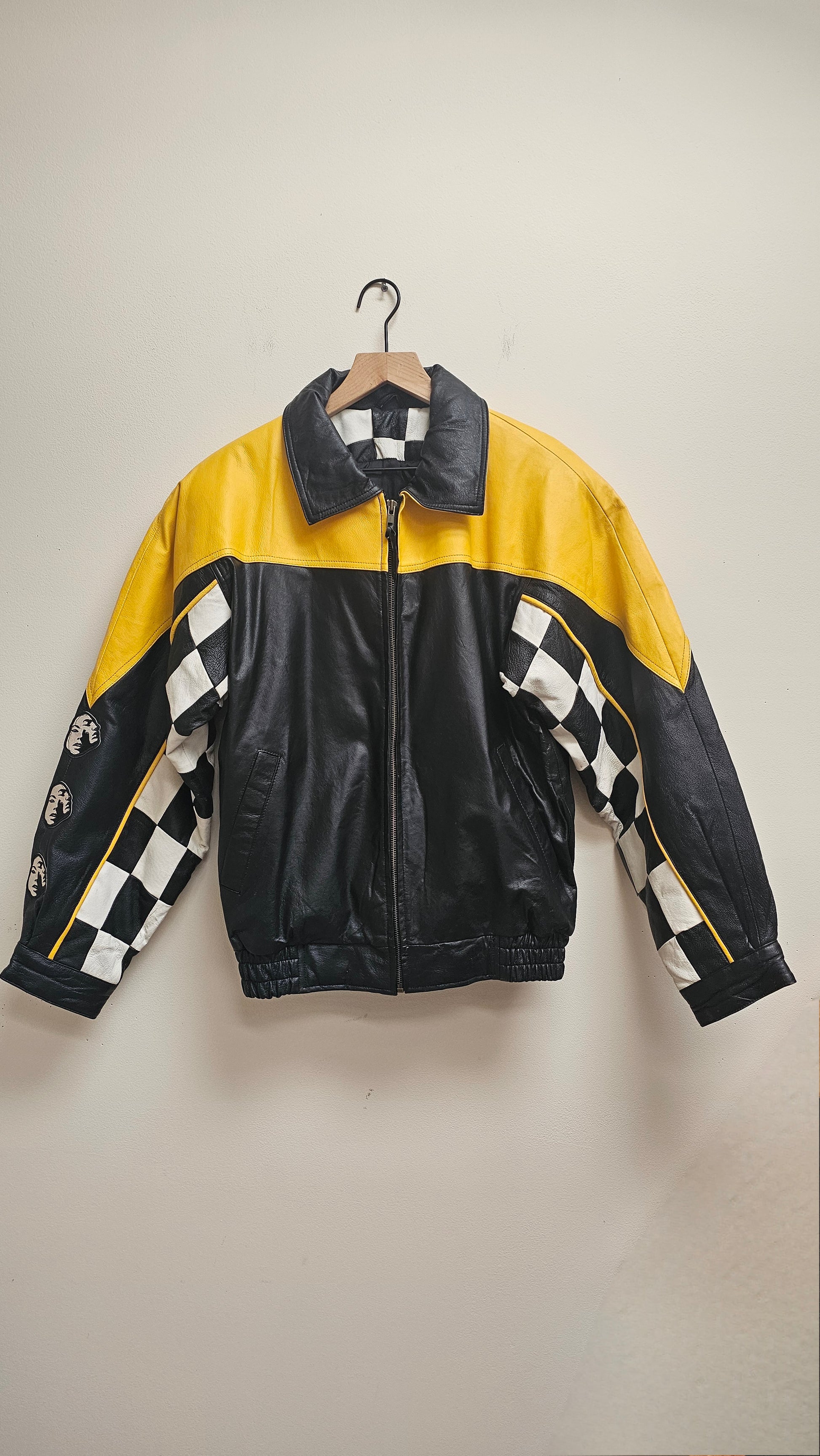 This vintage leather racer bomber jacket blends classic checkered and yellow panels for a standout look. Featuring a zip closure, elastic waist, and side pockets, it offers comfort and practicality. Designed with an oversized unisex fit, it suits all styles, while the custom face patches on the left sleeve add a unique personal touch. Perfect for those seeking both vintage flair and everyday wearability.